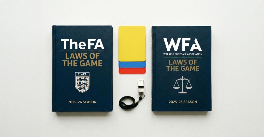 Below you’ll find a rule-by-rule breakdown of every meaningful difference between the two codes, drawn directly from the official 2025/26 editions of both documents: The FA Walking Football Laws of the Game (February 2025) and the WFA Laws of the Game (April 2025).